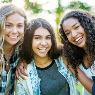 Three teen girls smiling and posing for a photo, representing adolescent gynecology